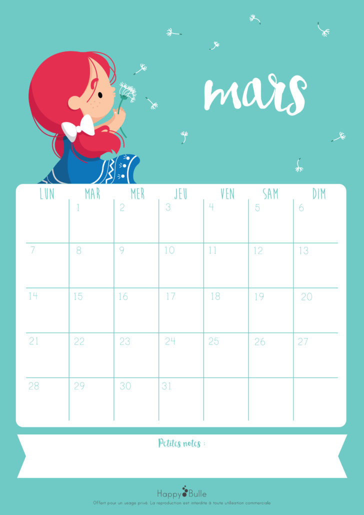 Alors le calendrier de Mars est printanier! Une petite fille à jolie robe, des fleurs... Cliquez sur l'image ci dessous, imprimez au format A4 et amenez un peu de soleil sur vos murs ! :)