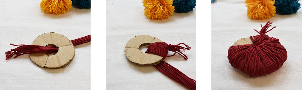 3. Découpez un petit morceau de laine et placez-le entre les deux cercles en carton, réalisez un nœud bien serré qui maintiendra en place la laine de votre pompon. Après cela, vous pouvez retirer les cercles en carton.