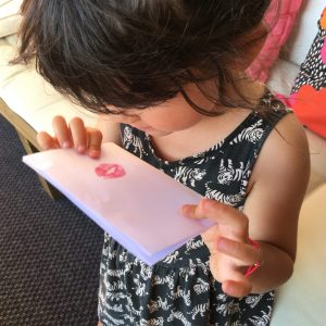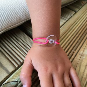 C'est donc un peu en panique que j'ai pris mon plus beau rouge à lèvres et posé mon plus beau bisou sur une feuille blanche. Avec ce joli bisou de maman, j'en ai fait (enfin surtout la Happy Team à vrai dire) un petit bracelet acrylique avec un cordon rose fluo flashy qui correspond bien à ma poupette.