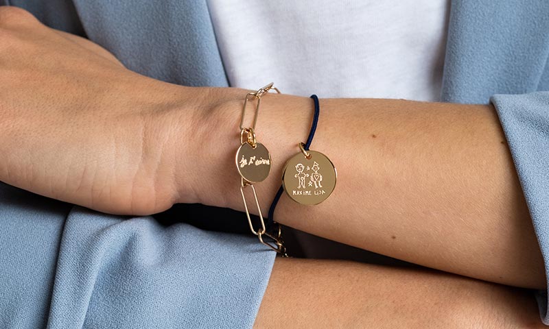 Como es bien sabido, los niños son pequeños artistas en ciernes; ¡les encanta dibujar en todas partes y en todo momento! Piensa en tomar fotos de sus creaciones más hermosas y conviértelas en joyas grabadas made in France. ¡Para el Día de la Madre, todas las mamás estarán encantadas de recibir un bracelet gravé con un "mamá, te amo" escrito por la mano aún vacilante de su pequeño! Todos los papás también estarán encantados de recibir un llavero personalizado con las huellas de los pies de su bebé para Navidad. ¡El resultado es tan conmovedor!