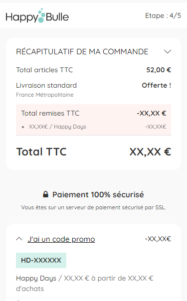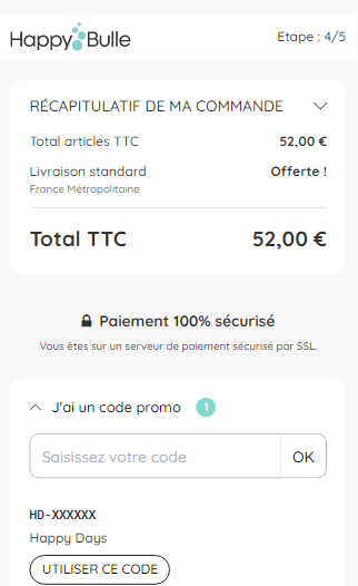 En bas de votre panier, vous verrez un encart Happy Days vous indiquant le montant de votre futur bon d’achat, correspondant à 20% du total de votre panier.