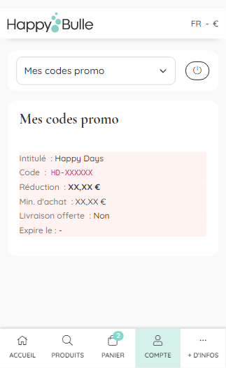 Vous pourrez également retrouver votre bon d’achat dans votre compte client sur HappyBulle.com en vous rendant dans « Mon Compte », puis dans la rubrique « Mes codes promo »