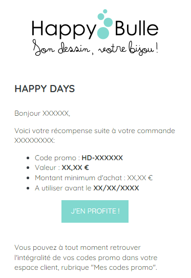 Lorsque votre commande sera expédiée, vous recevrez un nouvel e-mail nommé "Voici votre code promo" correspondant au bon d'achat que vous avez généré suite à votre commande en date du Happy Days.